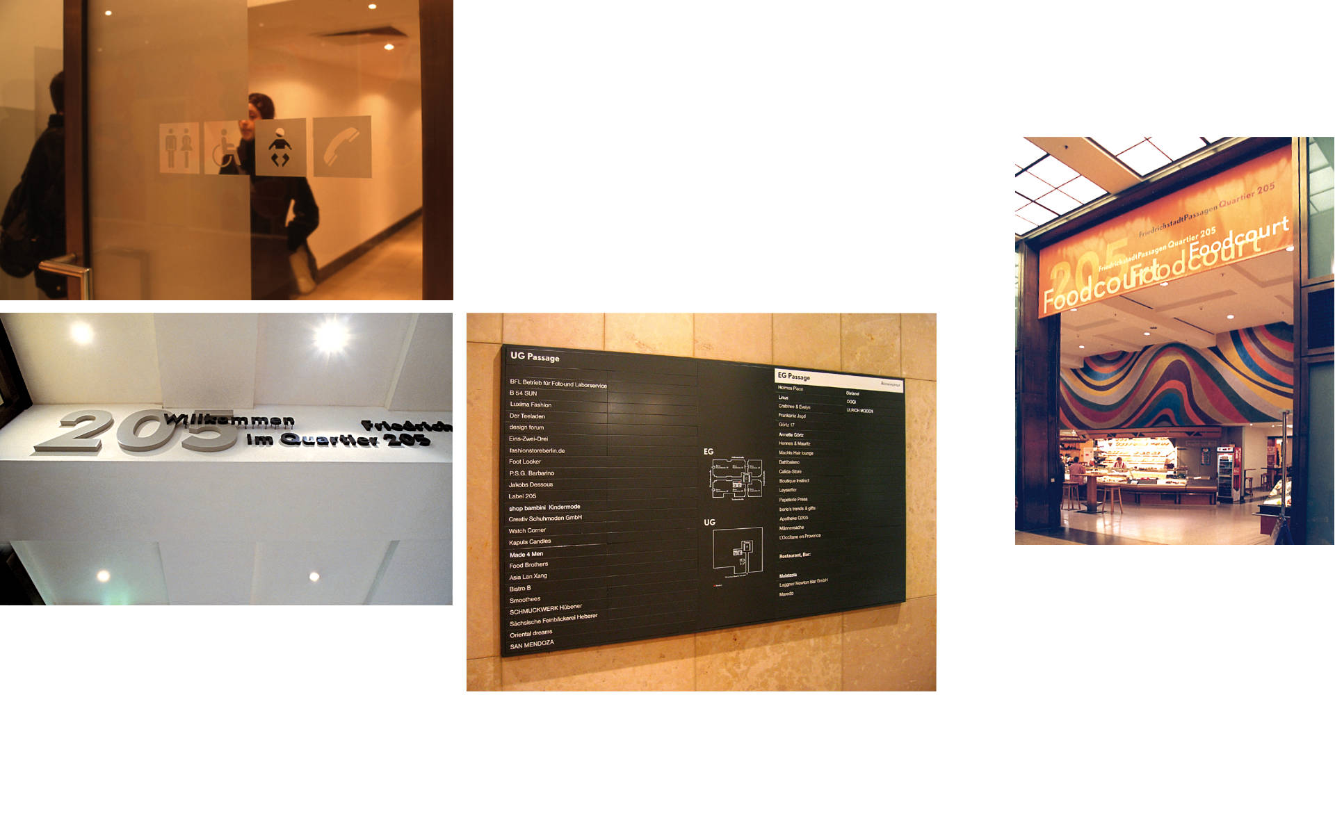 Für den Auftraggeber Tishman Speyer, New York, wurde ein komplexes Orientierungssystem für die Einkaufspassage, das Bürohaus und die Parkgarage Quartier 205 Friedrichstraße, Berlin, konzipiert. Grundlage der Gestaltung war die Architektur, die verwendeten Materialien und Nutzerkonzeption, sowie eine Identitätsförderung des Hauses. Designumfang: Mieterübersichten, Informationsstelen, Raumgestaltung mit Reliefschriften, Austellungsgestaltung, Transparente, Leitsystem Parkgarage, Richtungsorientierung, Wandbeschriftung.